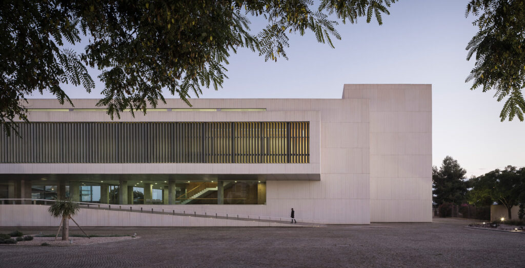 Dos grandes cajas acústicas de hormigón albergan el gran auditorio, a un lado de la plaza, y las salas para 450 y 150 personas al otro, ambas quedan unidas inferiormente por la plataforma elevada que acoge los camerinos, fosos, almacenes y el espacio expositivo bajo la plaza. En planta primera, un volumen sobre la rampa de acceso donde se disponen las salas congresuales une nuevamente las salas a esta cota procurando un recorrido circular. Por último, la cubierta de gran luz que cubre los auditorios se prolonga sobre la plaza protegiéndola como un palio flotante. El conjunto queda revestido por una serie de paneles prefabricados de hormigón blanco texturado con estrías verticales que vibran al sol de Ayamonte.