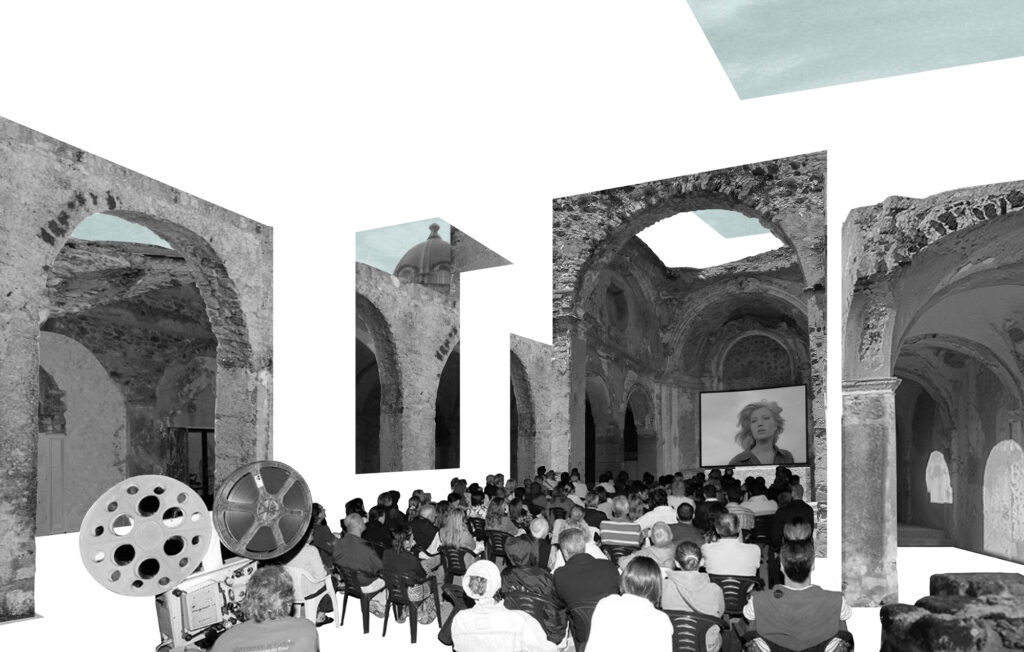 Las cicatrices que produce la historia enriquecen y provén de una densidad distinta a las cosas, haciendo desaparecer lo que no es esencial. Aquí reside la belleza de la ruina porque también hace referencia a lo que ya no existe pero se percibe por su ausencia. Pretendemos atender a estas ausencias con igual intensidad que a lo existente, queremos dar tanta importancia a aquello que está presente y a las relaciones que el paisaje y la ruina han construido como a lo que se desvaneció con el tiempo. Podemos rastrear las pistas que evocan aquello que debió ser y trabajar a partir de las ausencias reconstruyendo miradas y vínculos. Recuperar la nave blanca, la mirada axial desde el gran hueco abierto al mar y la cota perdida del campanario son intervenciones que atienden a las ausencias, a aquello que desapareció con en el tiempo pero que hoy podemos recobrar como verdadera esencia de la Catedral. Proponemos tejer una camisa que vista la ruina, ofreciendo refugio a ésta y enmarcando mediante recortes superpuestos los elementos que constituyen la realidad esencial de la Catedral: los elementos constructivos (el arco y el muro), los stucchi settecenteschi, las miradas sobre el paisaje y la relación con el Castello Aragonese. Una Máscara envolvente que evoque el espacio mediterráneo de la Catedral, un gran vacío blanco abierto al mar, y ofrezca la necesaria protección a los elementos más delicados, permitiendo el transcurrir de las instalaciones entre sus dobleces. La superficie de la máscara discurrirá por muros, suelo y cubierta, recortada allí donde queramos fijar la mirada e inducir recorridos, y trepará por la torre para permitir la visión perdida con el tiempo. Actuará como una protección frágil, de emergencia, que preserve la presencia inacabada de la catedral como una realidad vinculada definitivamente al paisaje y a la topografía del Castello Aragonese.