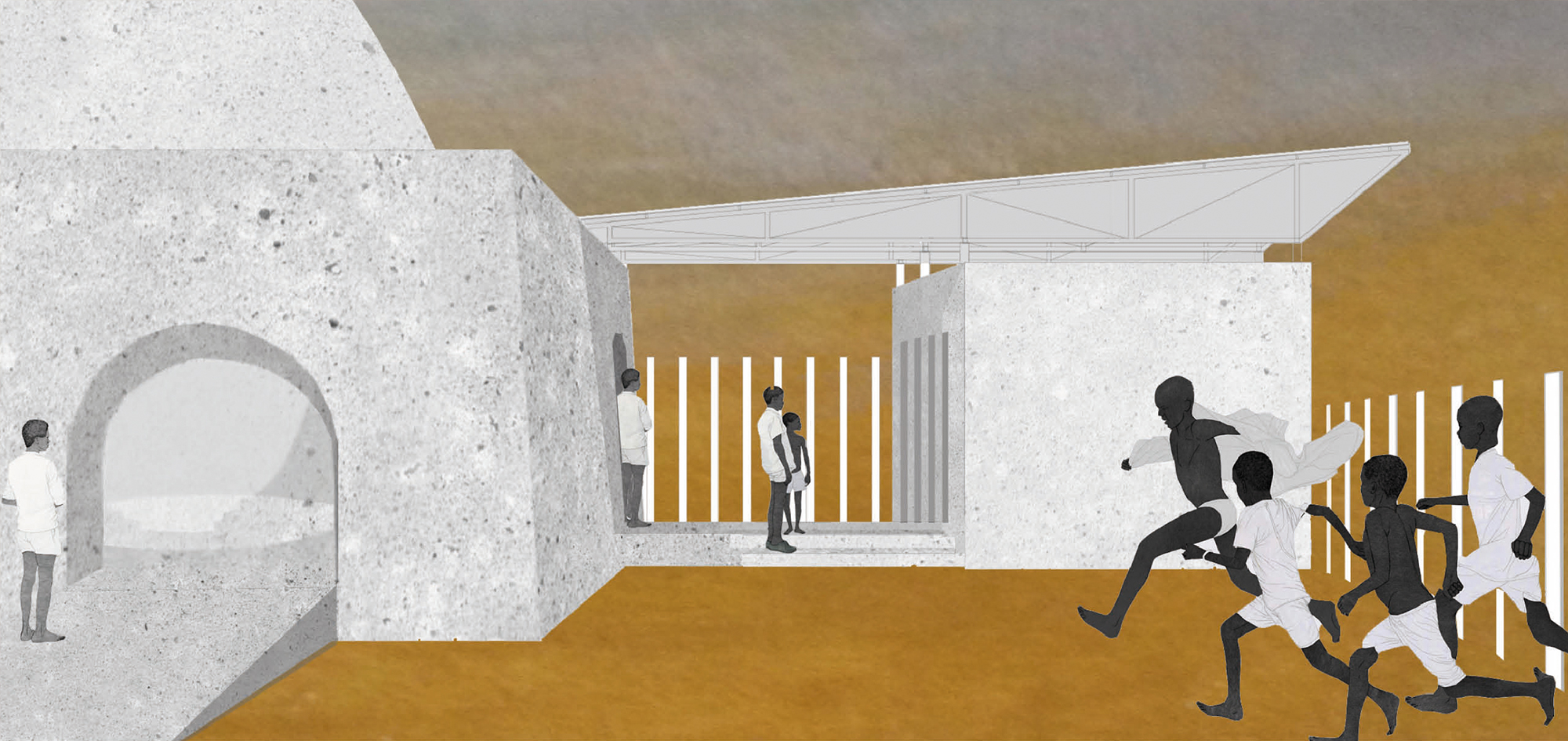 Estructura radicante. La Sabana tropical africana abarca un inmenso ámbito de diversidad cultural y climática. El proyecto de Escuela rural propuesto define un prototipo capaz de enraizar en los distintos territorios de esta franja continental mediante la adaptación a sus múltiples condiciones medioambientales, programáticas y constructivas. En botánica, se denomina organismo radicante a aquel capaz de echar raíces en diversos ecosistemas gracias a su capacidad de adaptación a las distintas circunstancias de su entorno, proponemos que esta arquitectura escolar participe de dicha cualidad: un núcleo constante que alberga el espacio común de encuentro y los usos asociados al agua se erige como elemento de enraizamiento al lugar, a partir de él, una estructura porticada, modulada y flexible, permite desarrollar el programa docente en función de las distintas orientaciones, de los vientos dominantes, de las circunstancias físicas del emplazamiento o del número de aulas requerido.